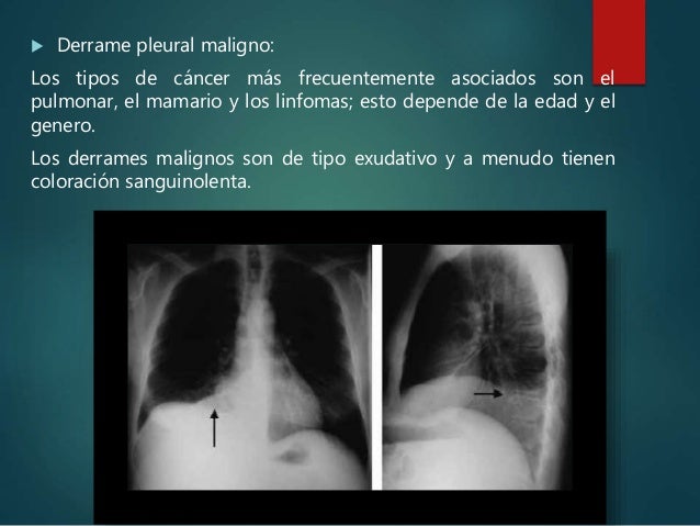 Tipos de derrame pleural. Cómo detectar los tipos de derrame pleural. Para saber si se padece o no este trastorno y a cuál de los tipos de derrame pleural se enfrenta, es indispensable que acuda a su proveedor de atención médica y consulta con él la posible tenencia de los síntomas respectivos. Él realizará la evaluación pertinente y procederá a indicar el debido diagnóstico según sea el caso. Derrame pleural es.Slideshare. Derrame pleural, concepto, caracteristicas, tipos. Utilizamos tu perfil de linkedin y tus datos de actividad para personalizar los anuncios y mostrarte publicidad más relevante. Neoplasia » definición, tipos de tumor, causas y tratamientos. La neoplasia, es también conocida a nivel científico como tumor o blastoma. Esta se desarrolla como una masa anormal de tejido, neoplasma, que va creciendo de forma descontrolada. Esto se debe a la multiplicación de algunas células, que no mueren cuando deberían, lo cual va formando una masa distinta en el tejido corporal, las cuales. O que é derrame pleural Água no pulmão planeta biologia. • Empiema septado é redondo • mais um caso de derrame pleural encistado (o mesmo que septado). Observar a reflexão da pleura visceral. Provavelmente este paciente teve alguma sequela passada ou em curso que justifique essa aderência da pleura, a qual se reflete e “encista” o derrame. Derrame pleural síntomas, tratamientos e información. Qué es. El derrame pleural consiste en la ocupación del espacio pleural, que está comprendido entre los pulmones y el tórax, por un exceso de líquido forma natural suele haber una pequeña cantidad de fluido en la región, pero esta patología se produce porque hay más de lo normal. Search for symptoms,causes and treatments of pleurisy.For your health.